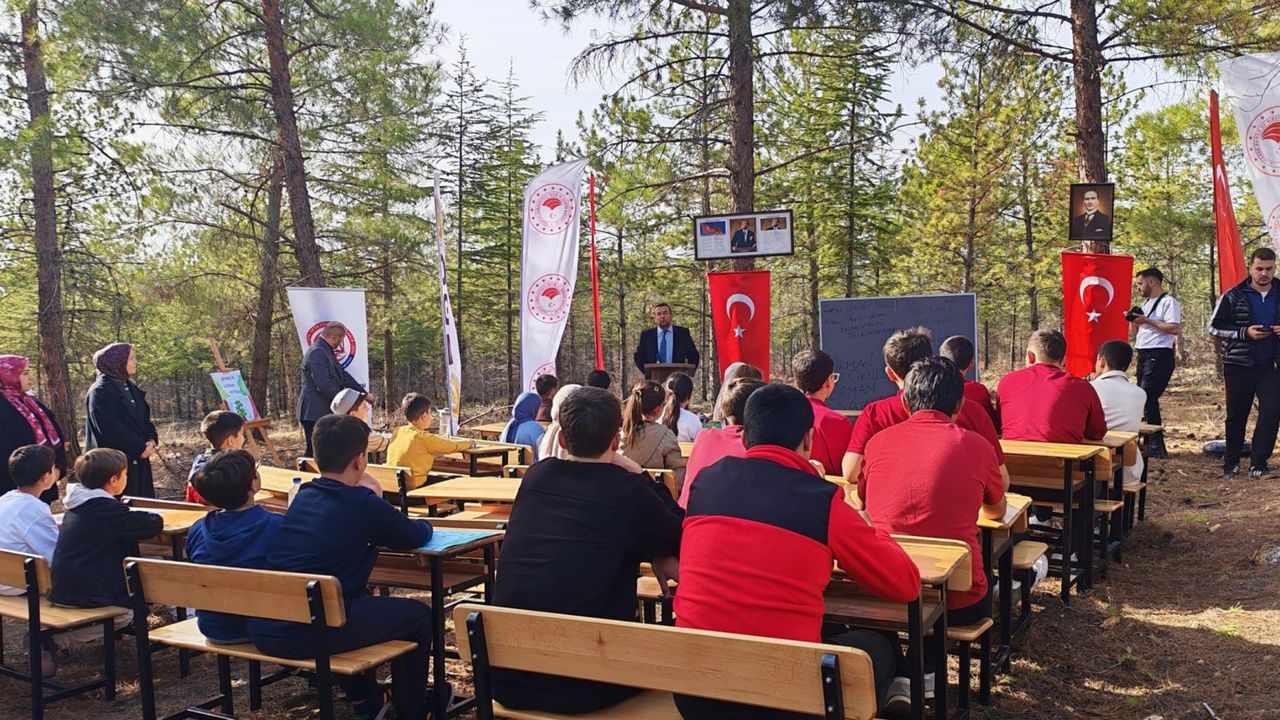 Kızılbayır mevkisindeki ormanlık alana gelen öğrenciler, buralarda Türk bayraklarıyla süslenen ve sıraların konulduğu alanda ders işledi.