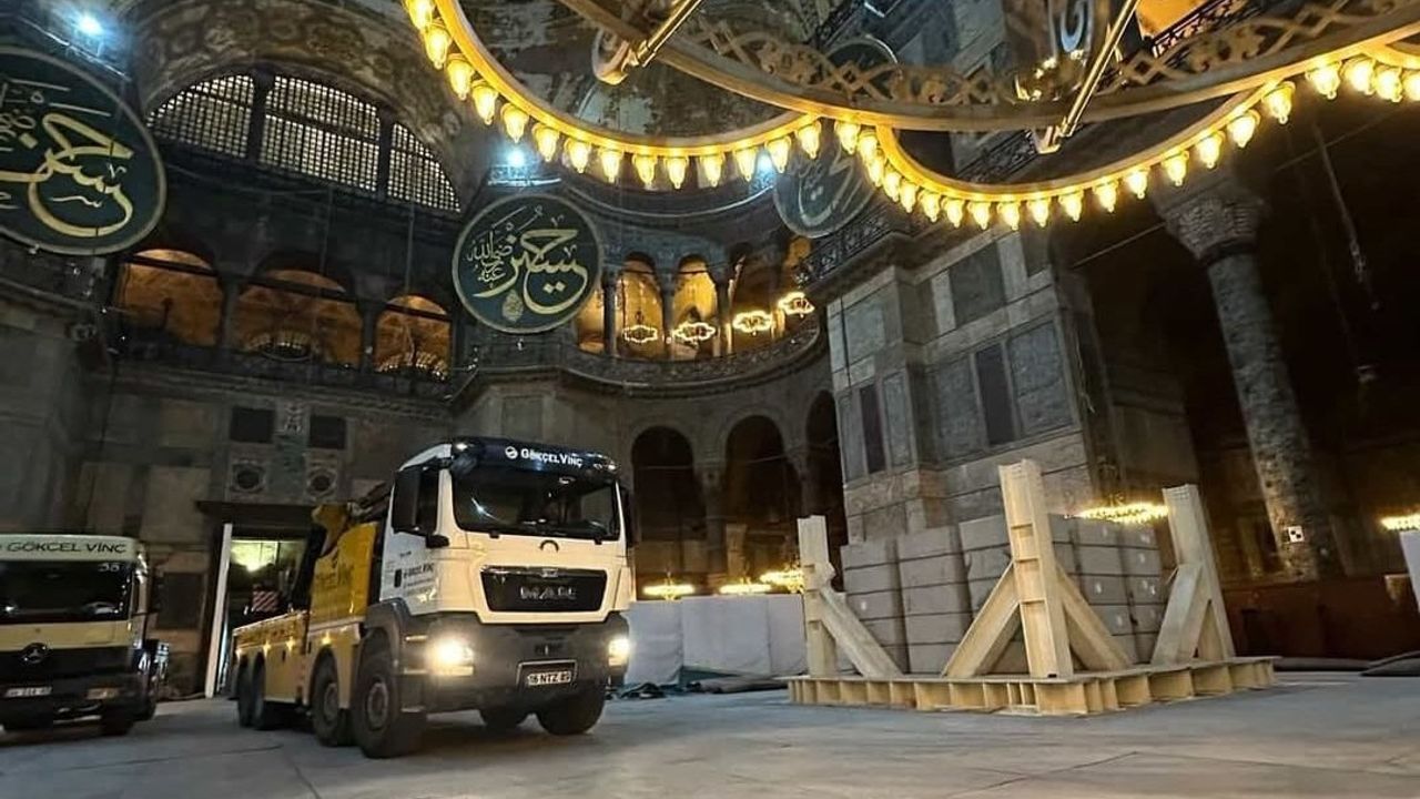 Çelik malzemelerin taşınması için iş makinesi kullanımının zorunlu olduğunun da Bilim Heyeti tarafından tespit edildiği kaydedilen açıklamada, “Zemin için statik hesaplar, yükleme testleri, zemin sınıfı analizleri ve georadar taramaları yapılmıştır. Zemin taşıma kapasitesi m² başına 25 ton olarak ölçülmüş; bunun üzerine m² başına 30 ton taşıyabilen özel bir sistem kurulmuştur. Çalışmalarda kullanılacak en ağır aracın zemine uyguladığı yük ise sadece 6 tondur, hazırlanan zemin bu yükü fazlasıyla taşımaktadır. Girişten harime kadar özgün mermerleri korumak için prekast, ahşap ve çelik elemanlarla güçlendirilmiş platform yapılmış; harimde mermer döşemeler belgelenmiş ve tüm zemin testleri tamamlanmıştır." denildi.