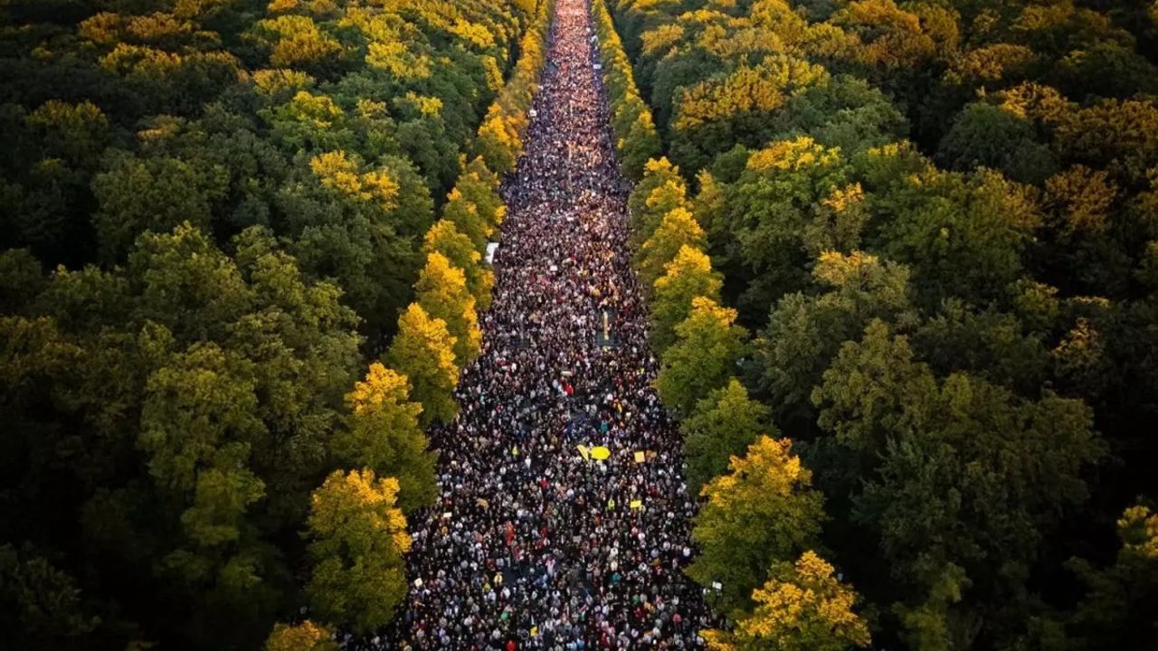 Eyalet Başbakanlığı önünde toplanan 100 binden fazla kişi, Federal Meclis önünden geçerek Berlin'in sembollerinden Grosser Stern Meydanı'na yürüdü.