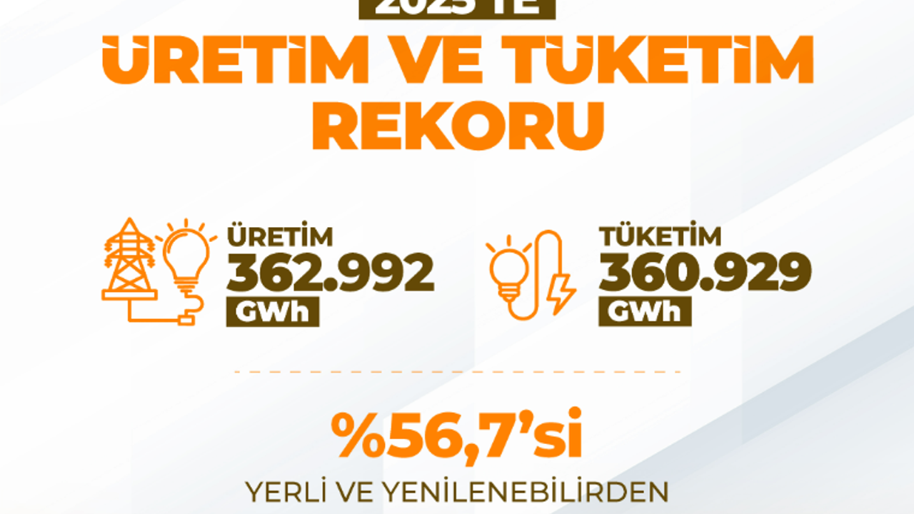 2025 yılında toplam elektrik tüketimi 360 bin 929 gigavatsaat ile tüm zamanların en yüksek seviyesine çıkarken, bu tüketime 362 bin 992 gigavatsaatlik rekor üretimle karşılık verildi.