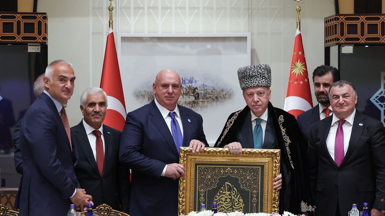 Heyet tarafından Cumhurbaşkanı Erdoğan'a Kafkas kalpağı papak, han kaftanı, Çırçırlı Ali Efendi'nin "Rabbi Yessir" duasının yer aldığı hat tablosu ve Türk boylarını simgeleyen kalem hediye edildi.