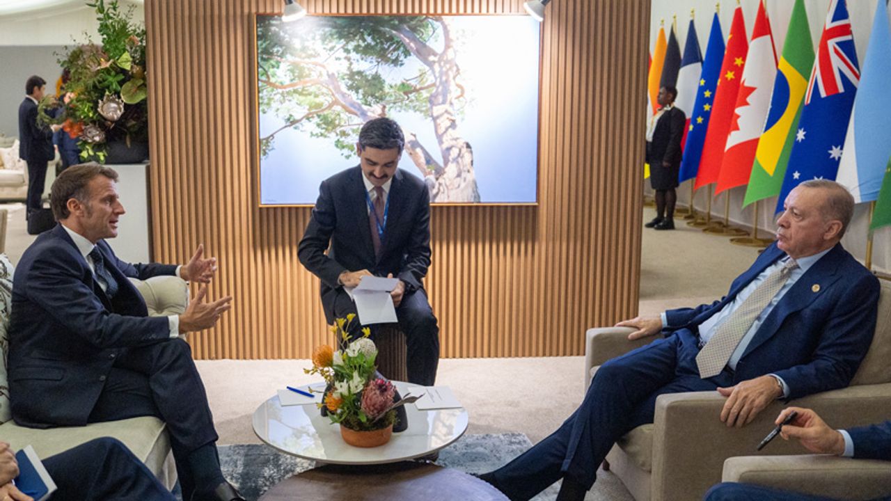 Cumhurbaşkanı Recep Tayyip Erdoğan, G20 Liderler Zirvesi için bulunduğu Güney Afrika Cumhuriyeti’nde Fransa Cumhurbaşkanı Emmanuel Macron ve İtalya Başbakanı Giorgia Meloni ile ayrı ayrı görüştü. Görüşmelerde ikili ilişkilerin yanı sıra Gazze ve Ukrayna meseleleri de ele alındı.