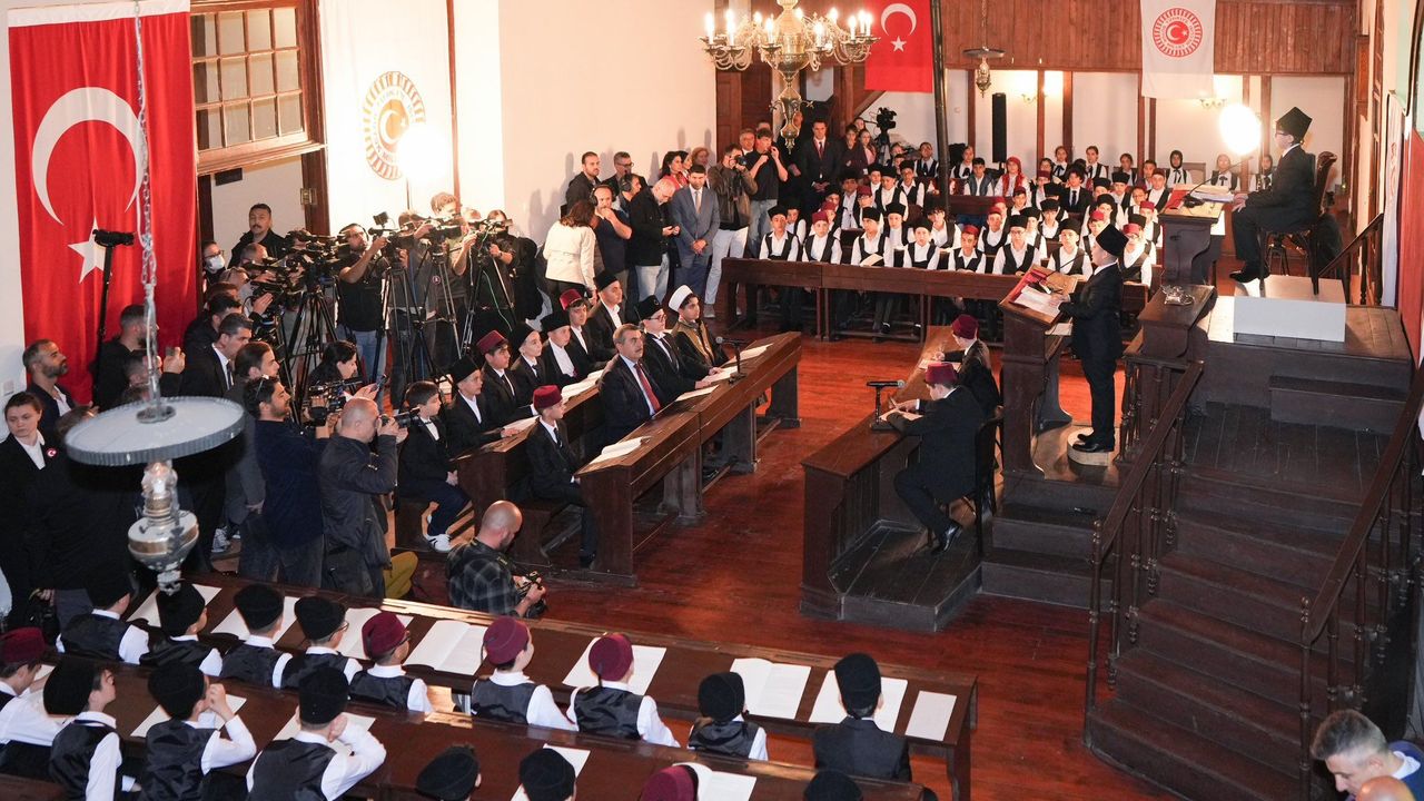 Döneme özgü kıyafetlerle tarihî Birinci Mecliste bir araya gelen öğrenciler, Bakan Tekin ile dualar eşliğinde temsili olarak Birinci Büyük Millet Meclisinin açılış kurdelesini kesti.
